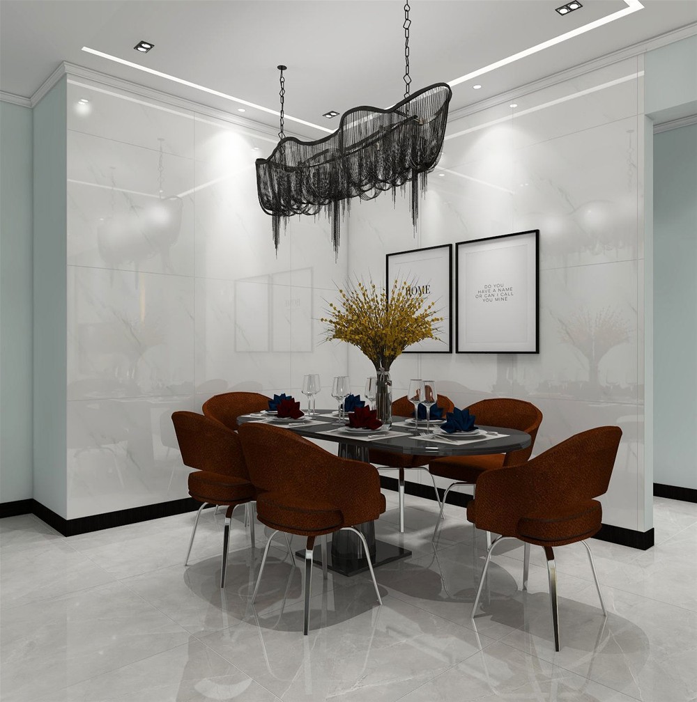 餐廳的色彩和質地是整個大空間的美好衍生,餐椅的布藝軟包沿用了高調的橙色,搭配雅士白餐廳背景牆,吊燈是創意十足的流蘇元素,帶來了十分愜意的用餐感受。