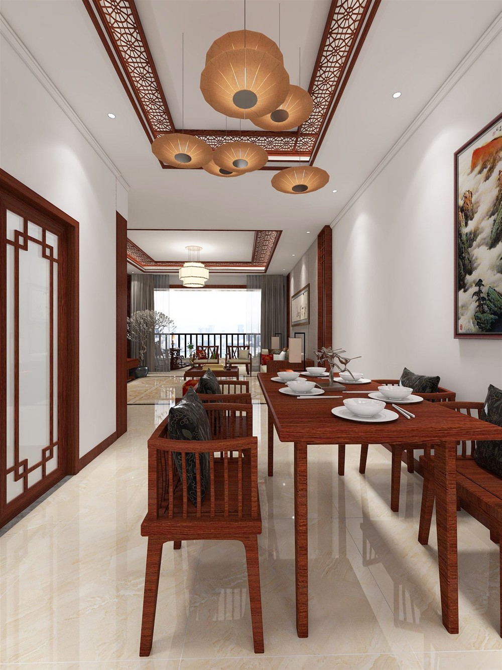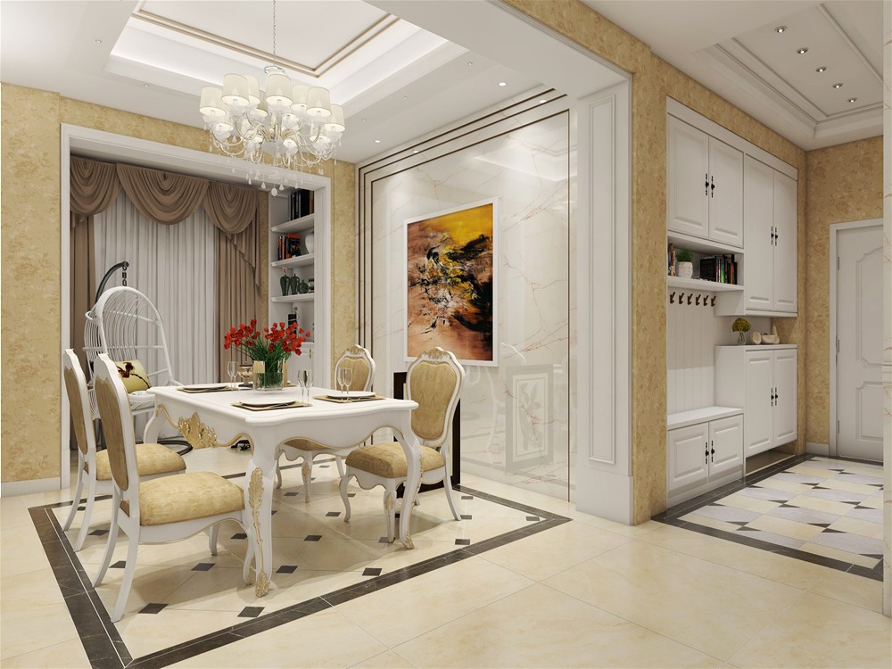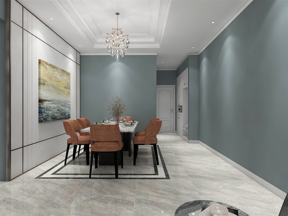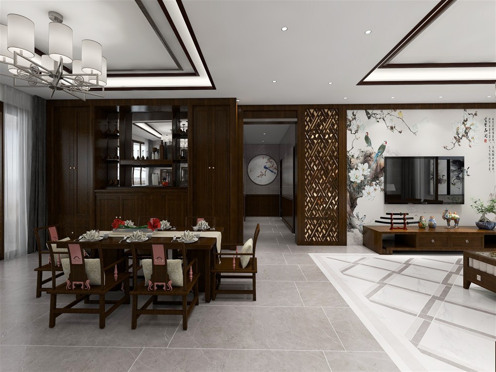 開放式的餐廳與客廳相連通,中間的走廊讓客廳、餐廳區域分明,餐廳矩形餐桌和複古的吊燈組合,天花是簡單的雕花,留住了中式韻味注入了新中式的創新元素。