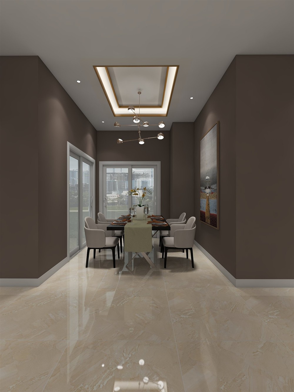 大麵積鋪貼的白色背景牆優雅脫俗,抽象的掛畫增添了幾分意境,深褐色的原木餐桌線條簡練,與天花相互呼應,讓現代家居裝飾更具中國文化韻味。