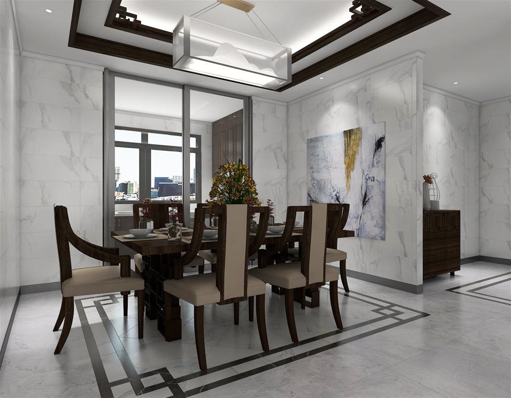 新中式餐廳地麵主磚 緞光釉KFD880+地麵拚花緞光釉KFD8806+牆麵緞光釉KFD8801