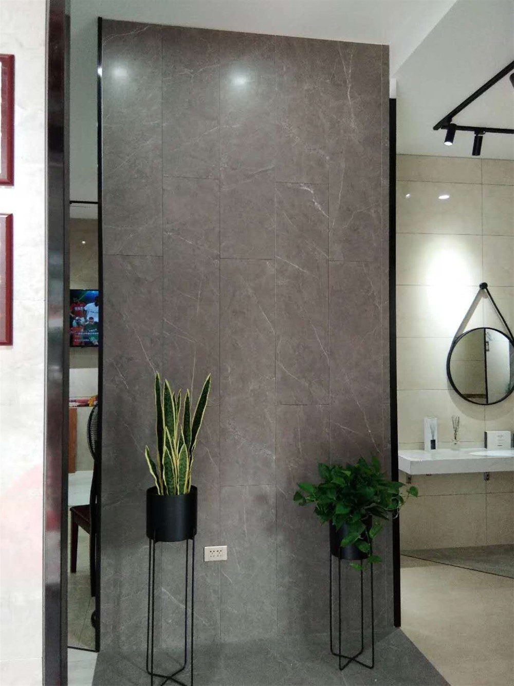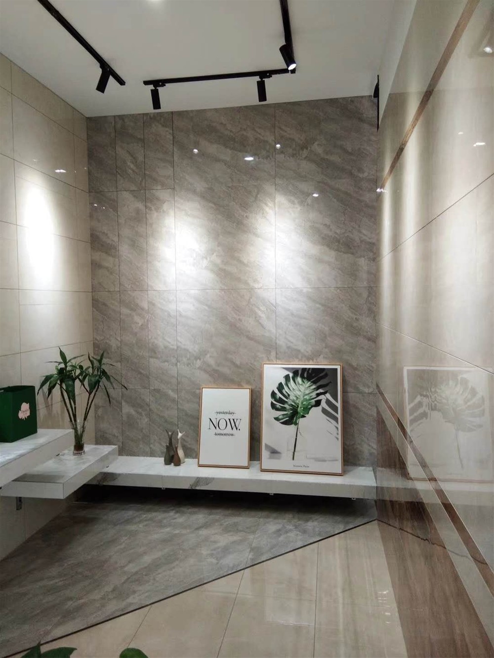 這是15°緞光釉鋪設的現代風格模擬間,沒有更多造型,簡單的瓷磚切割鋪貼,優雅大氣的瓷磚紋理運用錯位鋪貼而成的牆麵。