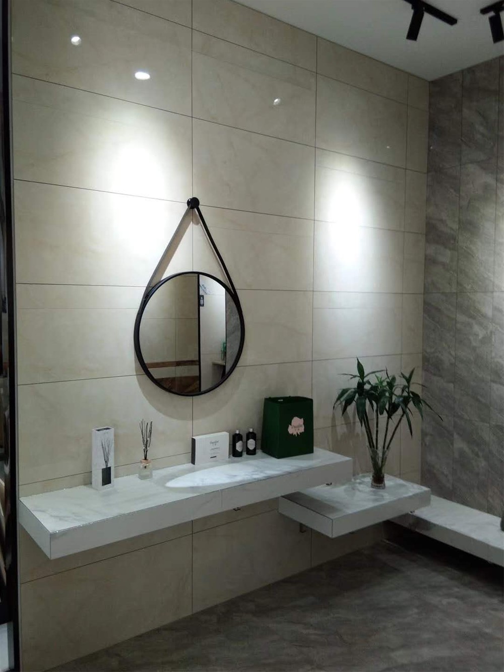 這是一個通體大理石瓷磚的模擬間,模擬了洗手間/客廳背景牆的立體空間,通過灰色和米色的冷暖色搭配,還原一個立體的空間造型,體現了整個空間的層次感。