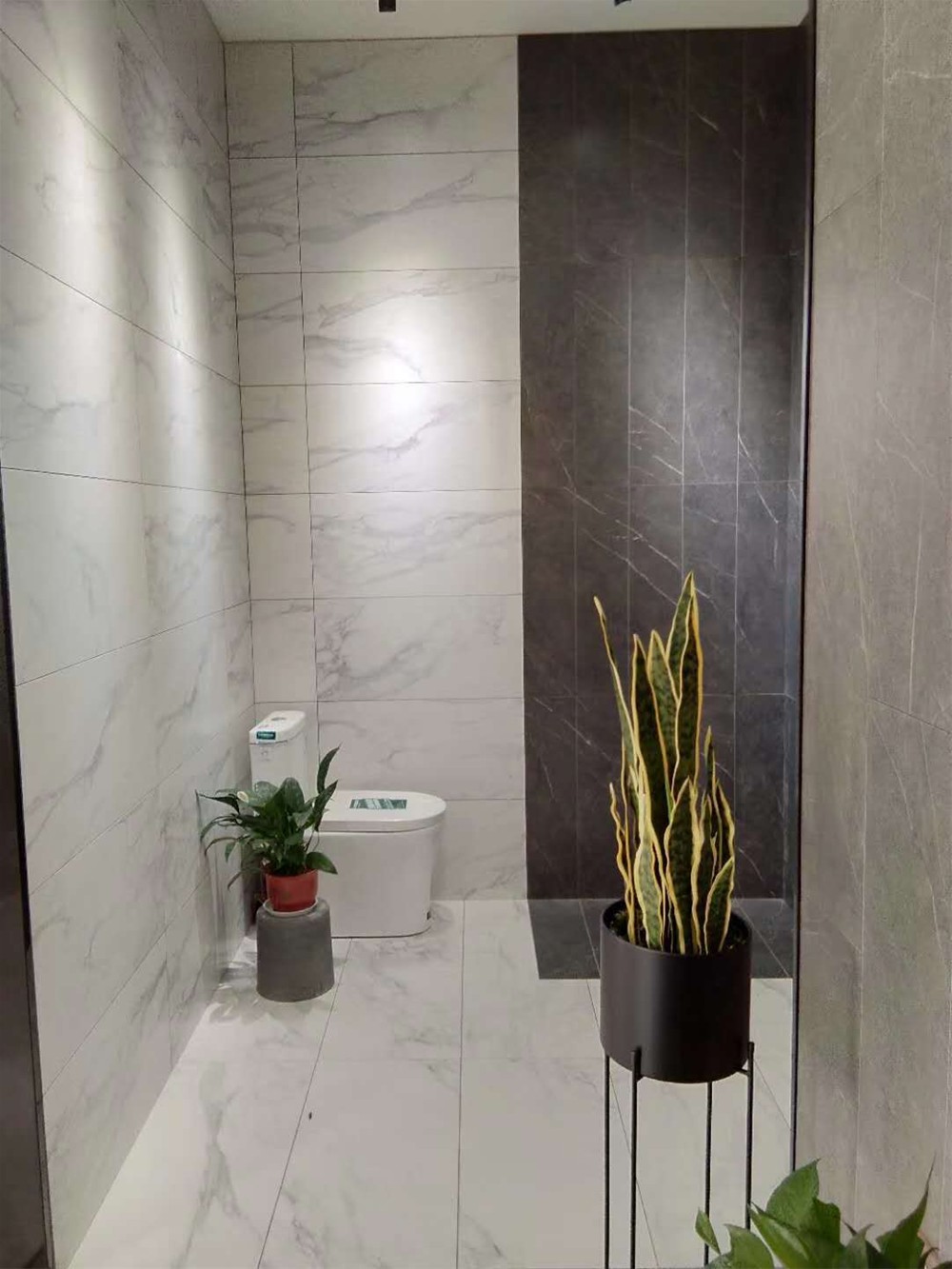 這是一個15°緞光釉的模擬間,一深一淺的顏色把衛生間的幹濕區域區分開來,小空間用白色瓷磚鋪設看起來寬敞明亮。