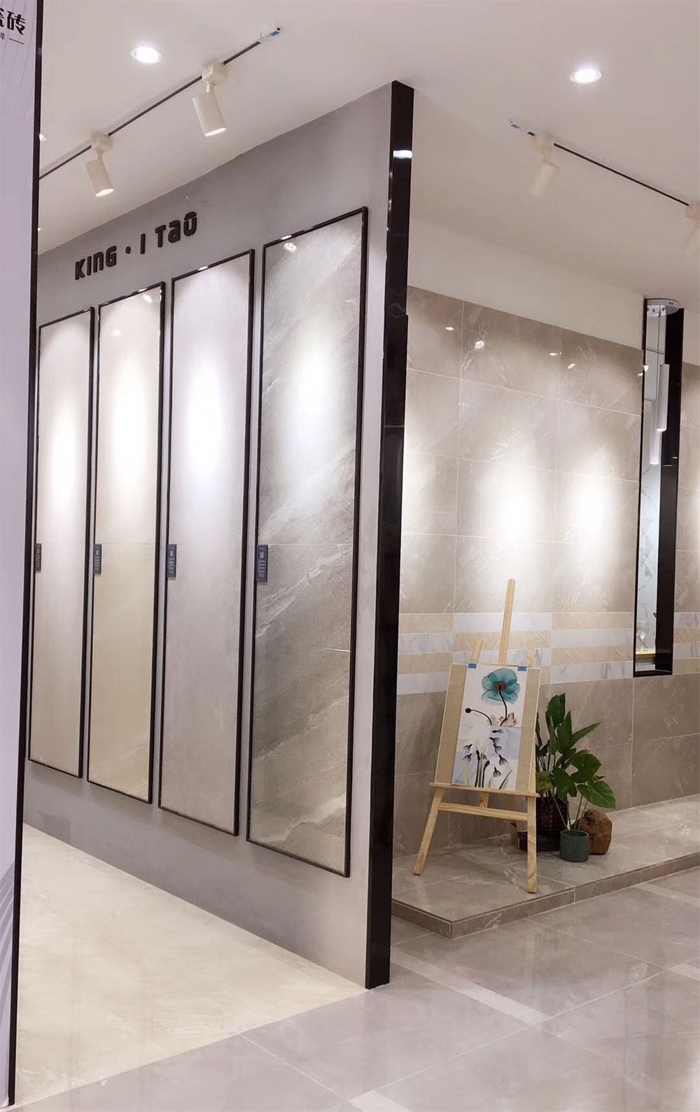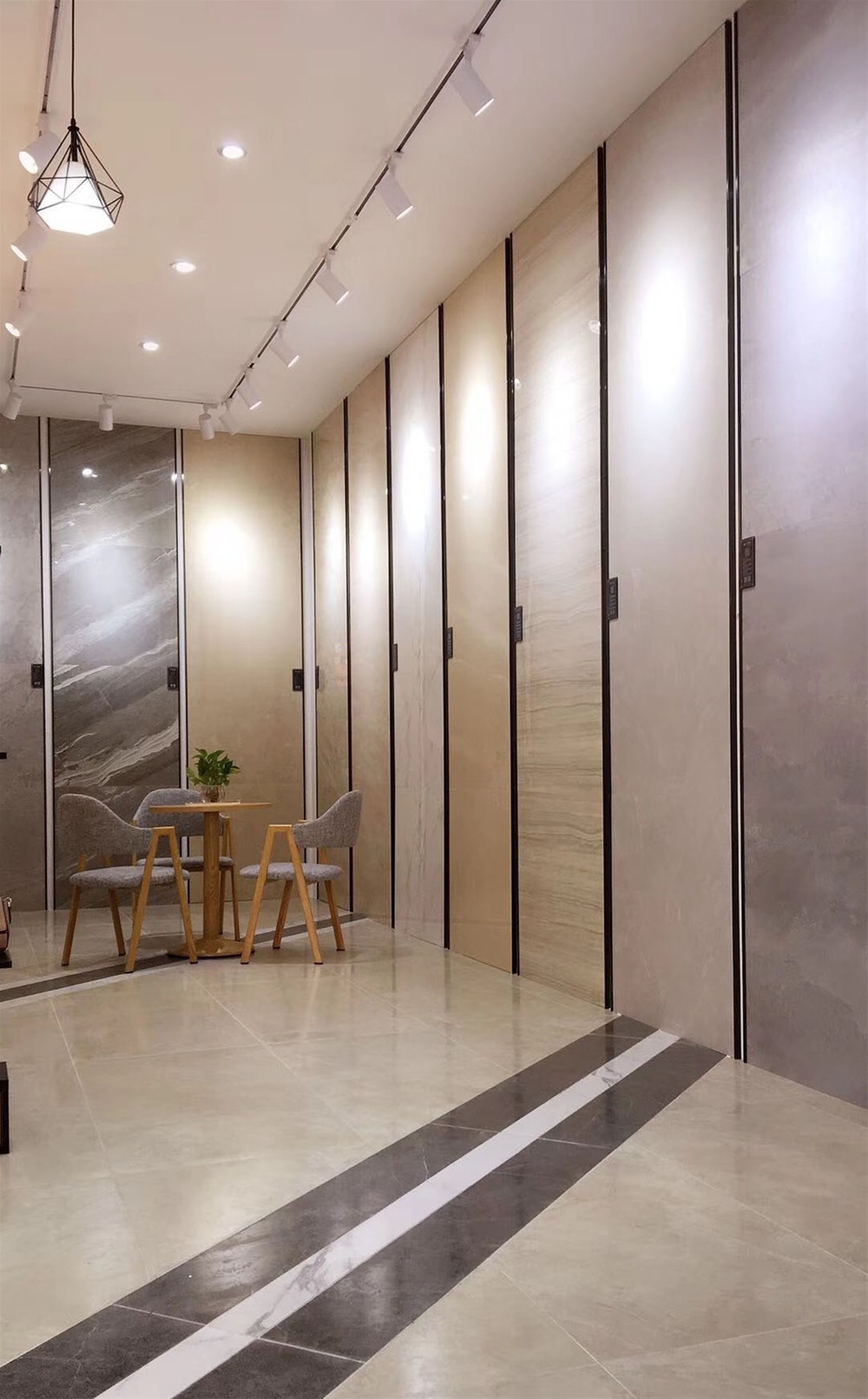 這是緞光釉卡拉卡白鋪貼的形象牆,白色的基調讓空間看起來寬敞明亮,灰色大紋理散發著優雅的氣息。