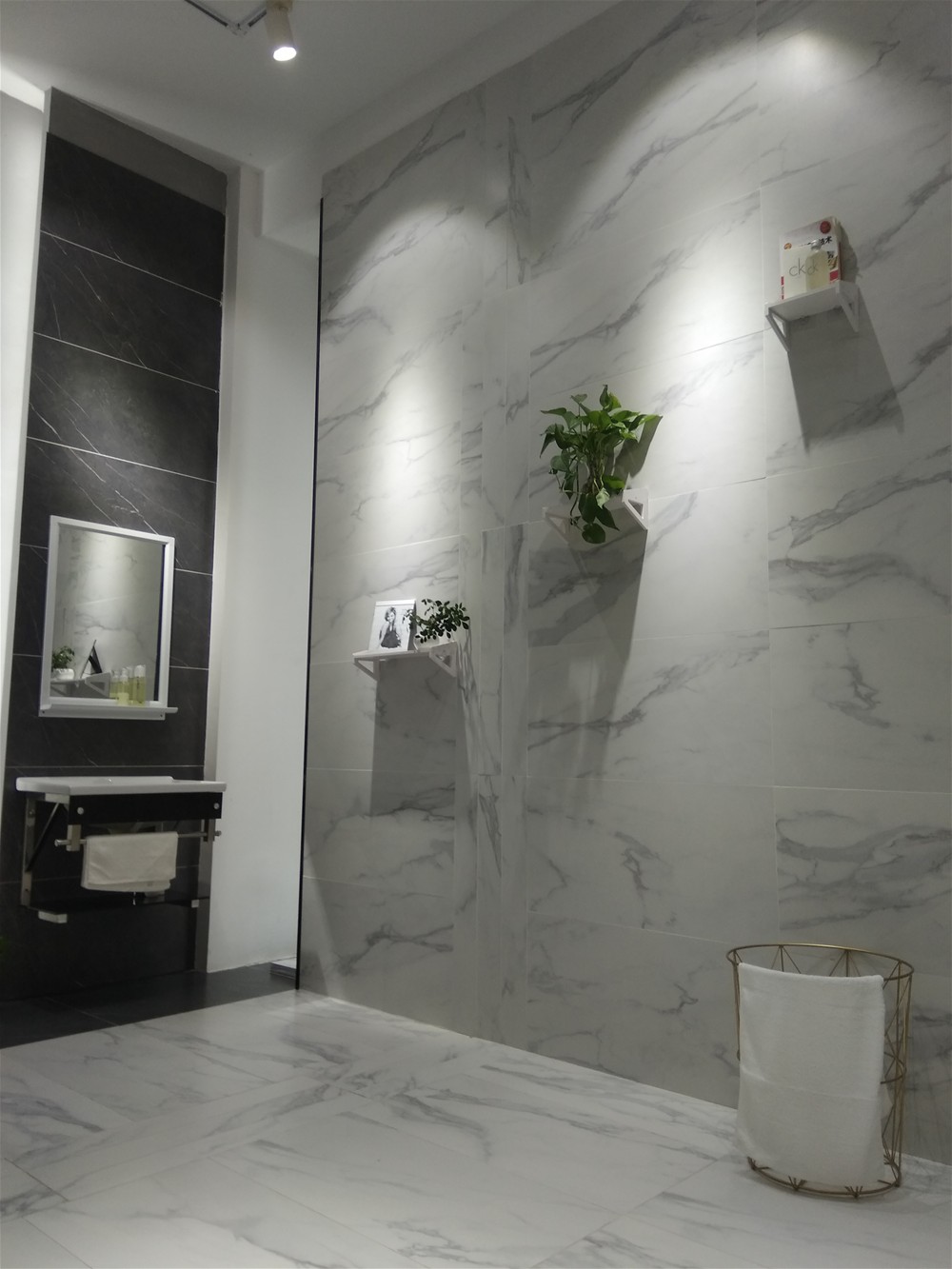 這是91看片的免费的网站陶新款的廚衛噴墨瓷片,卡拉卡白元素的瓷片優雅,非常適合現代風和輕奢風的91APP免费看片。