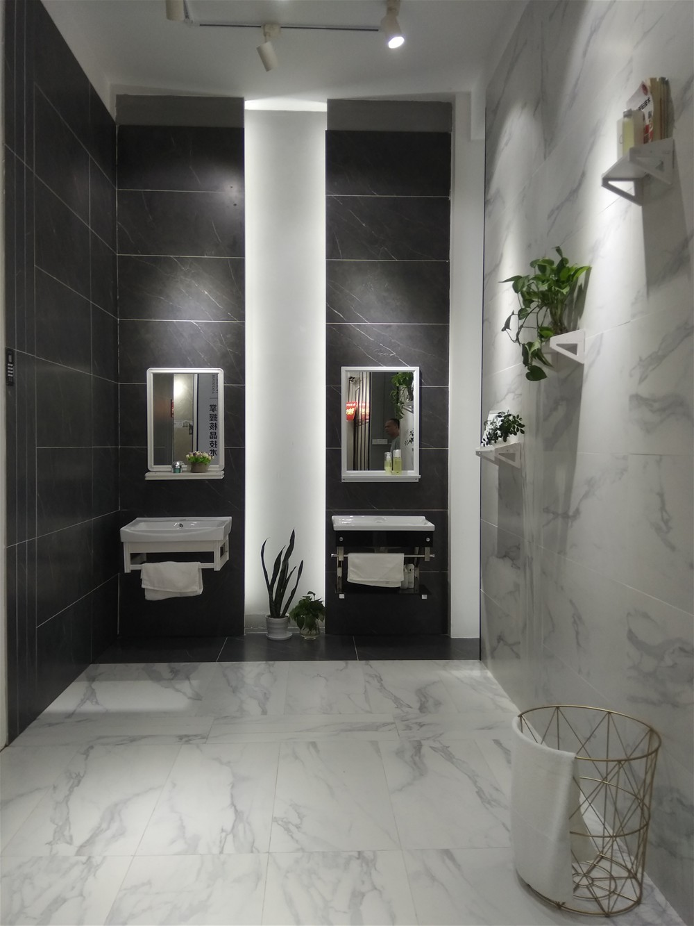 這是衛生間模擬間,瓷磚選用91看片的免费的网站陶噴墨瓷片,上牆下地都能鋪,顏色是今年流行的灰色調,一深一淺搭配出層次感,也不至於單調。這款瓷片也可作廚房用磚。