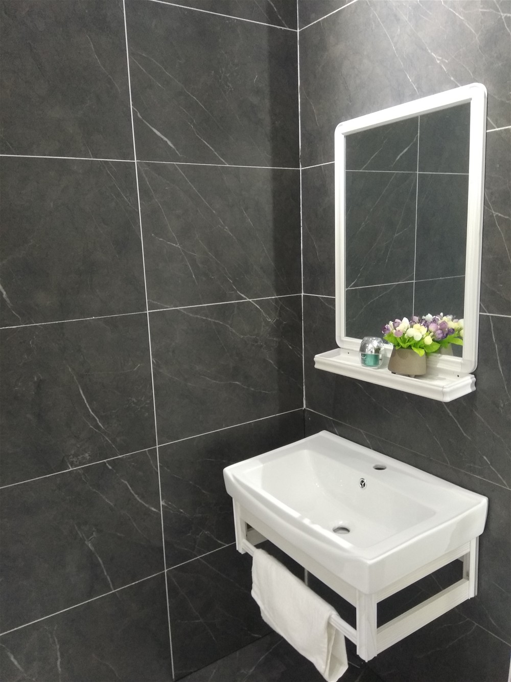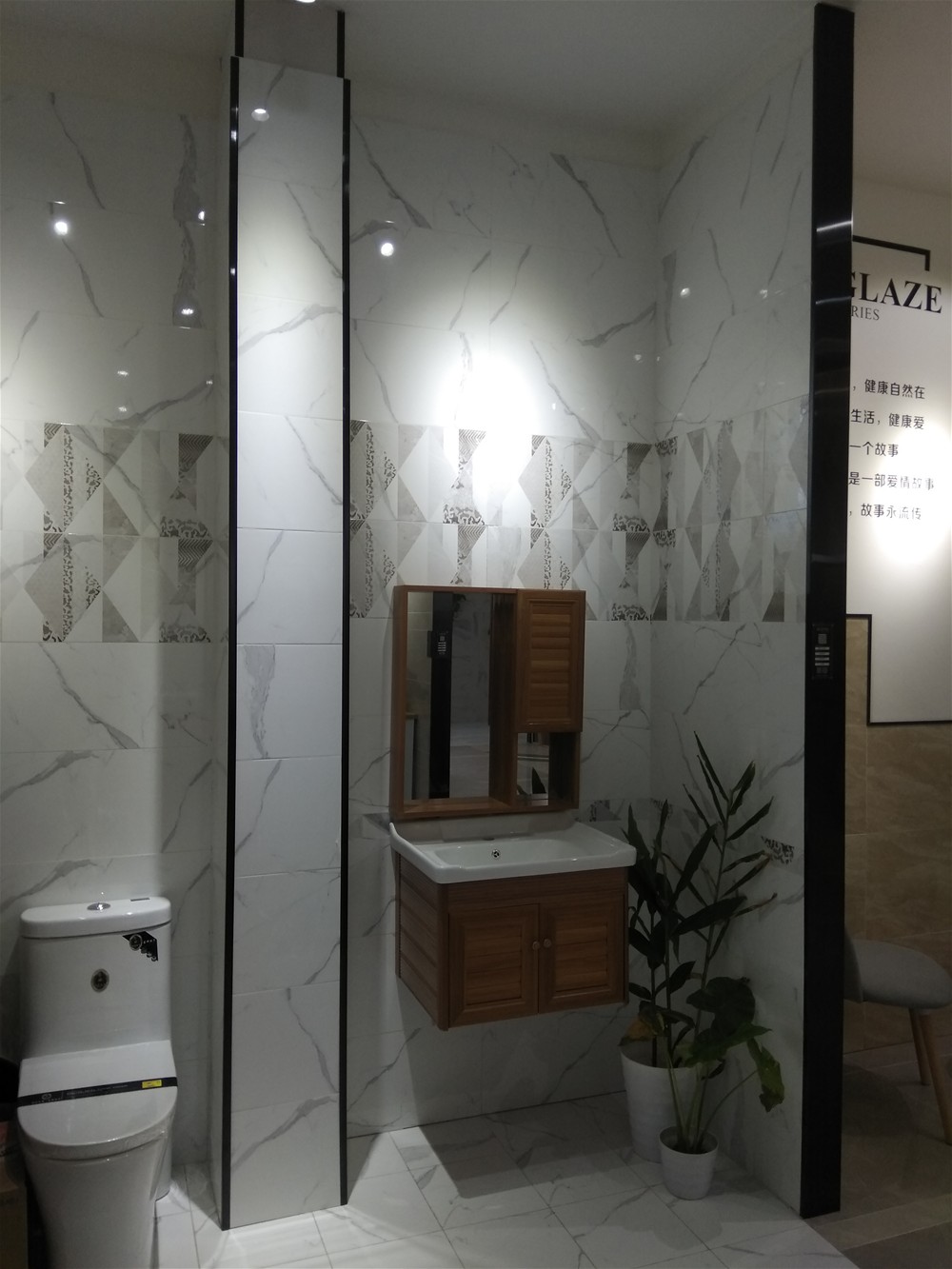 這是緞光釉鋪貼的衛生間模擬間,衛生間講究私密性,設計師一般考慮使用深色磚,緞光釉防滑度高,非常適合廚衛、陽台地磚牆磚使用。