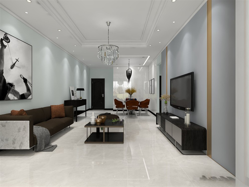 客廳以黑白灰為主色調,整個空間以簡潔明朗的線條組合,電視背景牆用金色材質點綴,地磚鋪貼潘多拉灰艾釉石,提亮了整個空間。