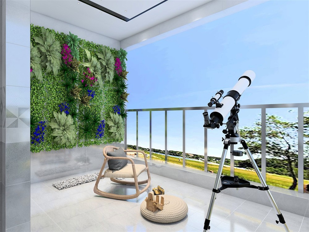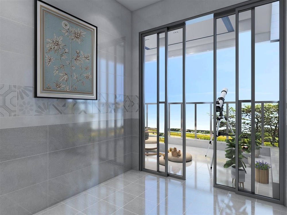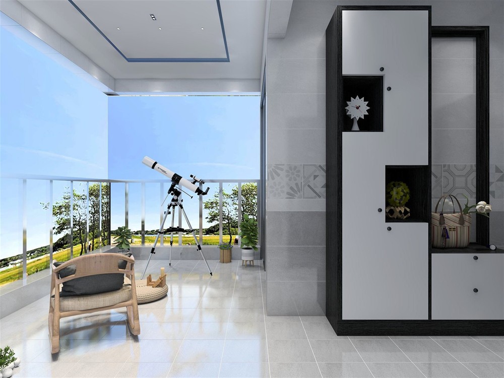陽台鋪貼的磚與廚房一致,淺灰色瓷磚打造質感空間同時也可以作為鋪色突出綠植的勃勃生機,營造自然愜意的空間。