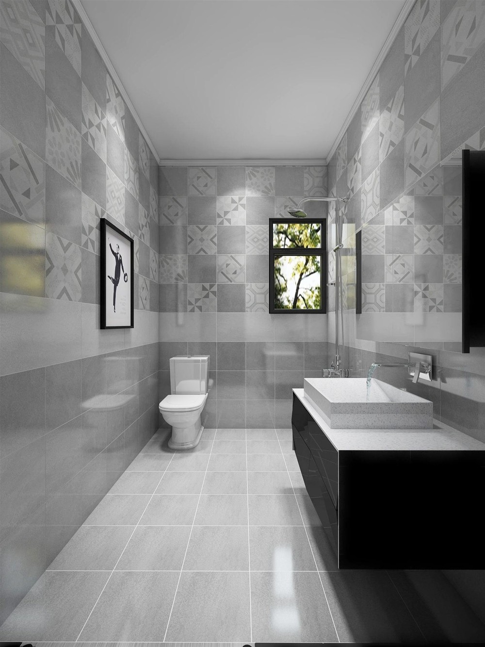 家用衛生間講究私密性,設計師選用淺灰色的噴墨瓷片,這是一款應用範圍廣泛的產品,一深一淺與花片搭配使用讓空間不會過於單調。