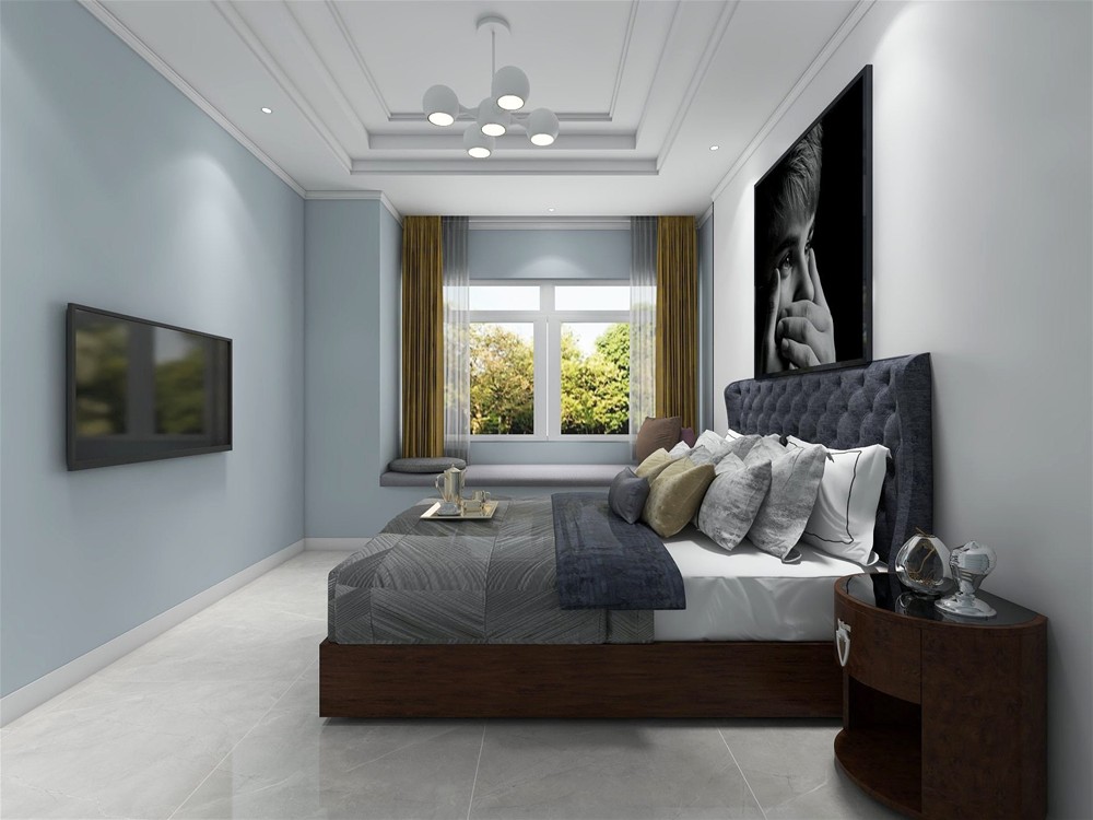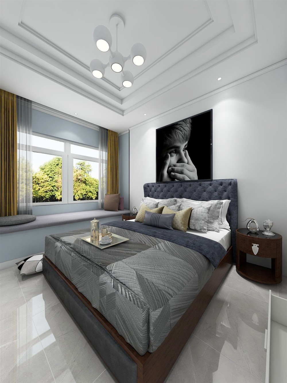 以灰色調為基調,地磚選用淺灰色艾釉石,大床選用相對地磚深一點的灰色,層次分明。
