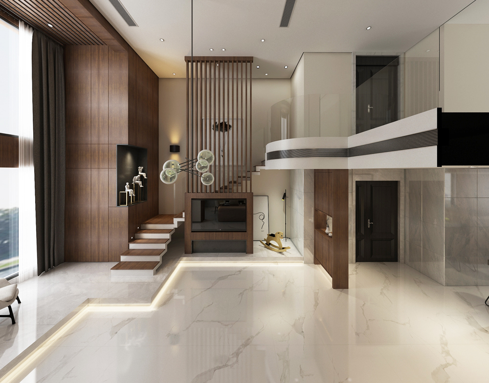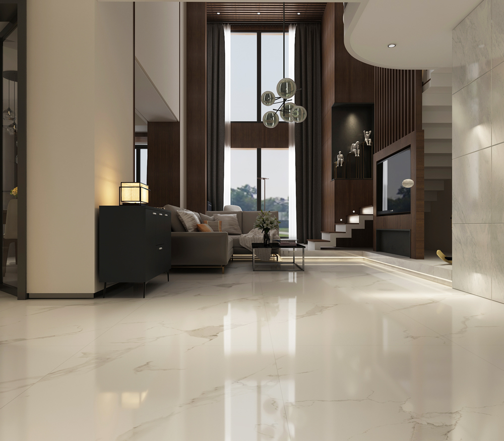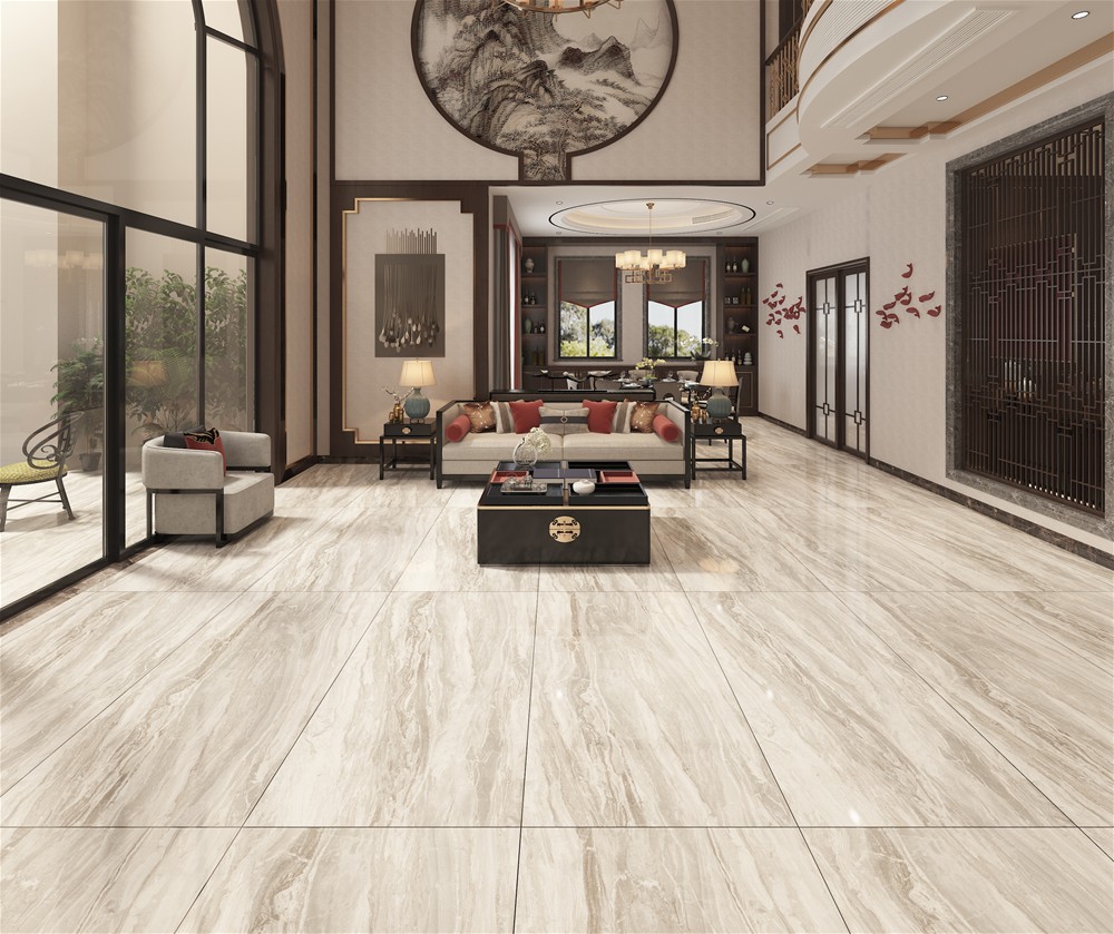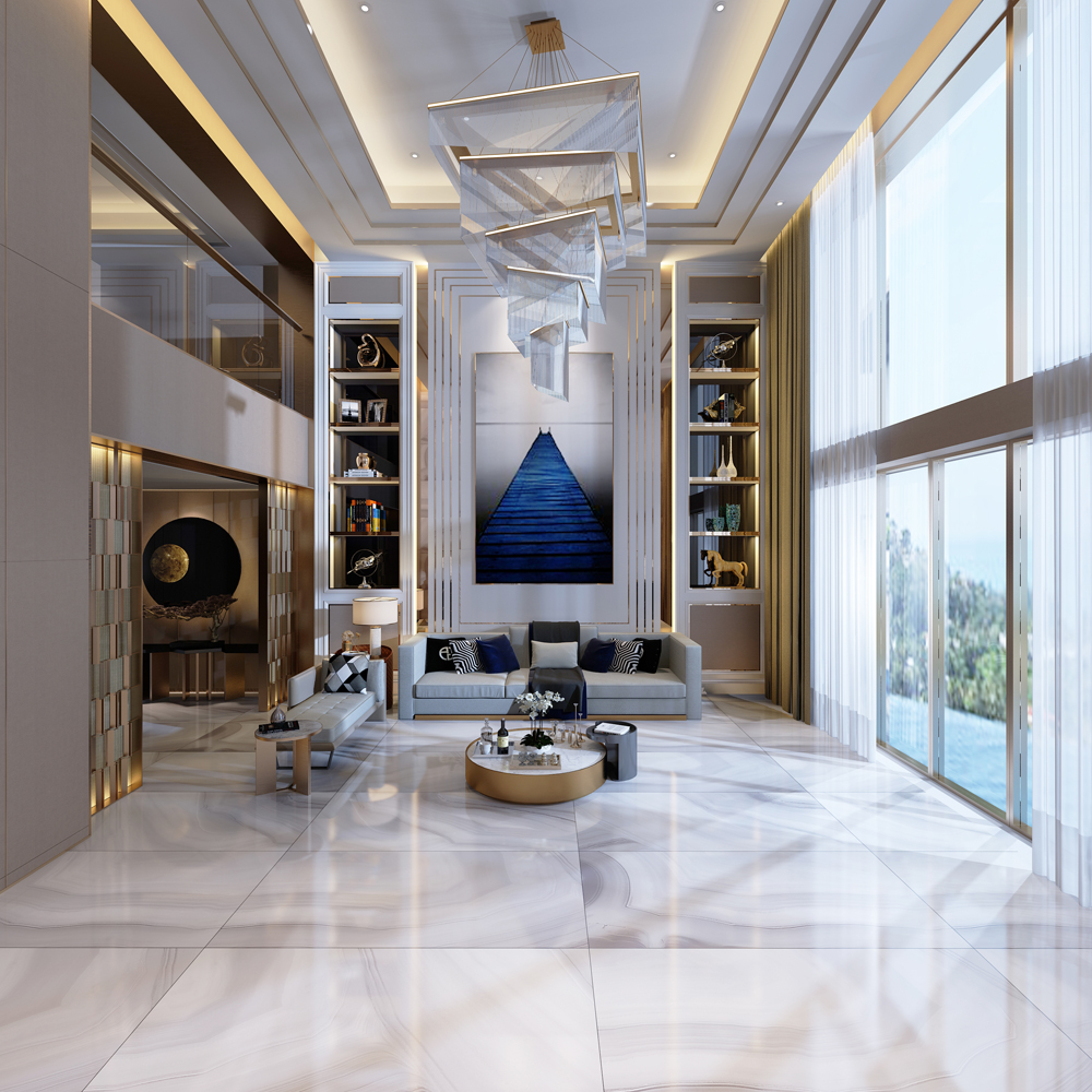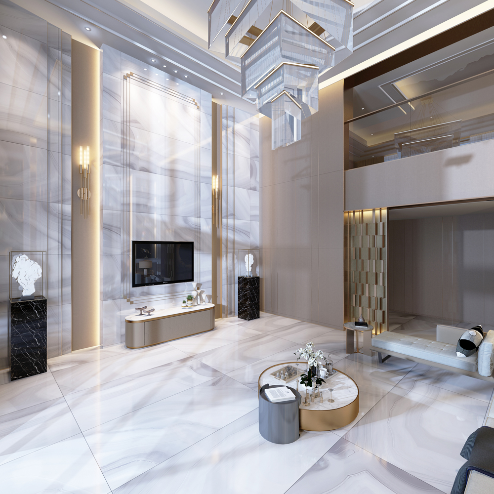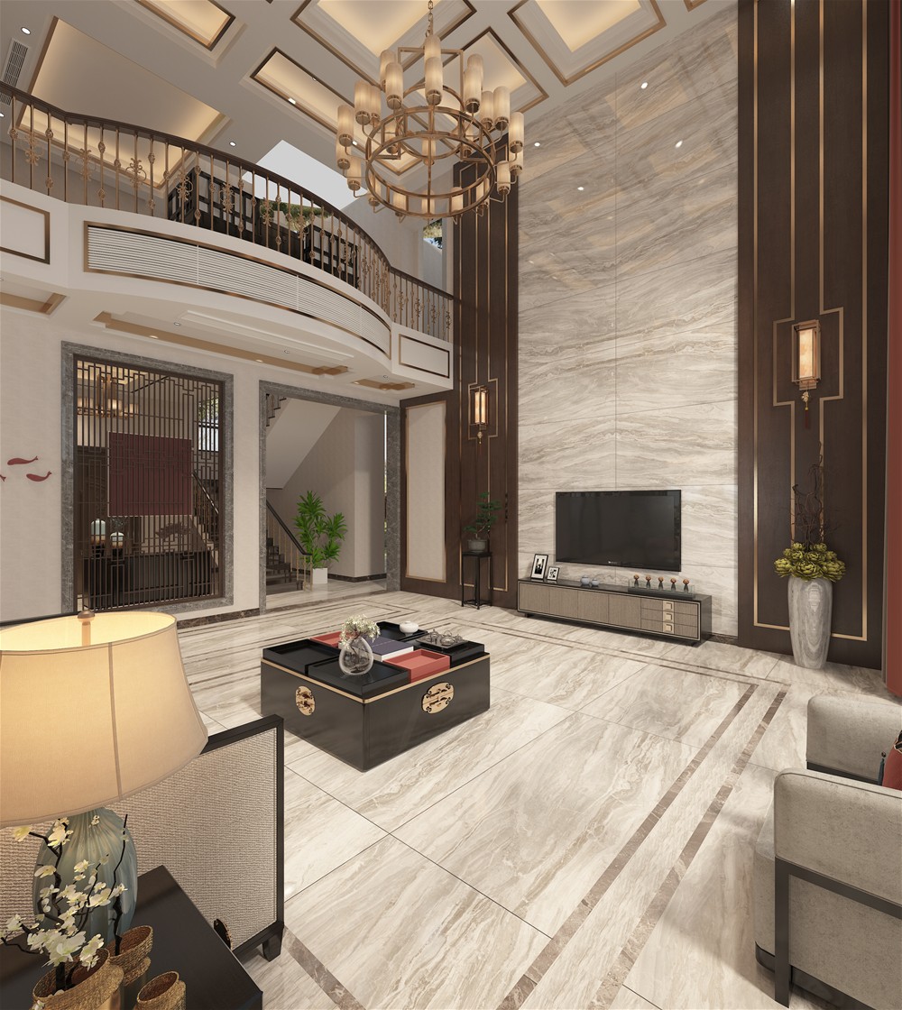 新中式的別墅客廳,磚麵飄逸的閃電紋,在大麵積鋪貼時呈現出更立體、更震撼的視覺效果。和天然石材如出一轍,實現原生態的無邊界視覺效果,營造大氣、優雅的空間。
