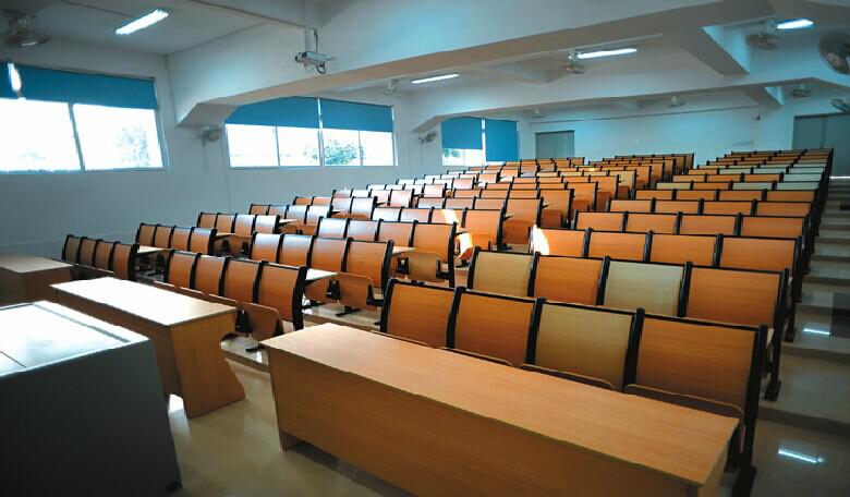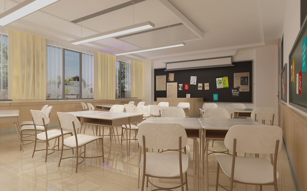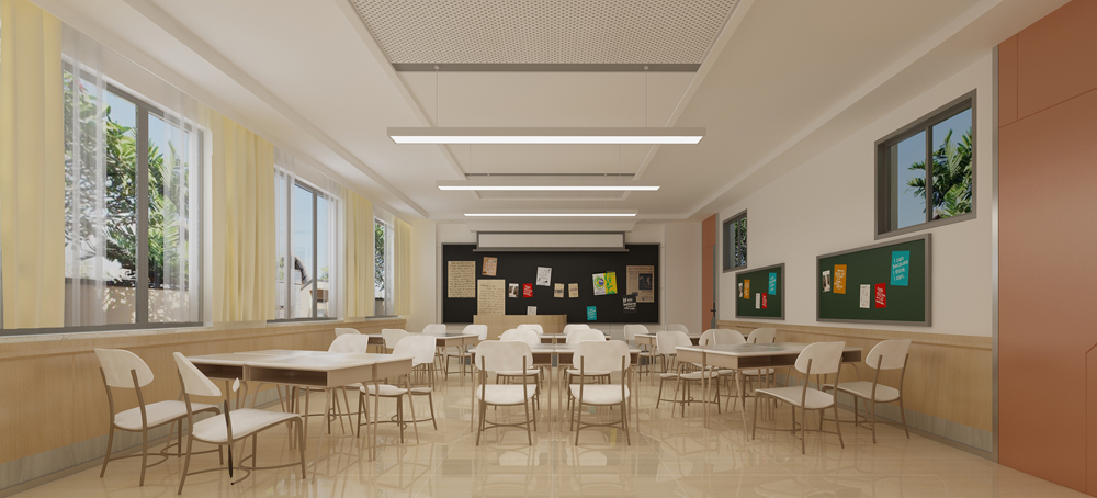 在大教室裏,設計師要營造的是活躍的氛圍,椅子選用兩個顏色組合,錯開擺放不會顯得過於沉悶。綠色又是代表著生機的顏色,勃勃生機,欣欣向榮,對保護孩子視力也有很大幫助。