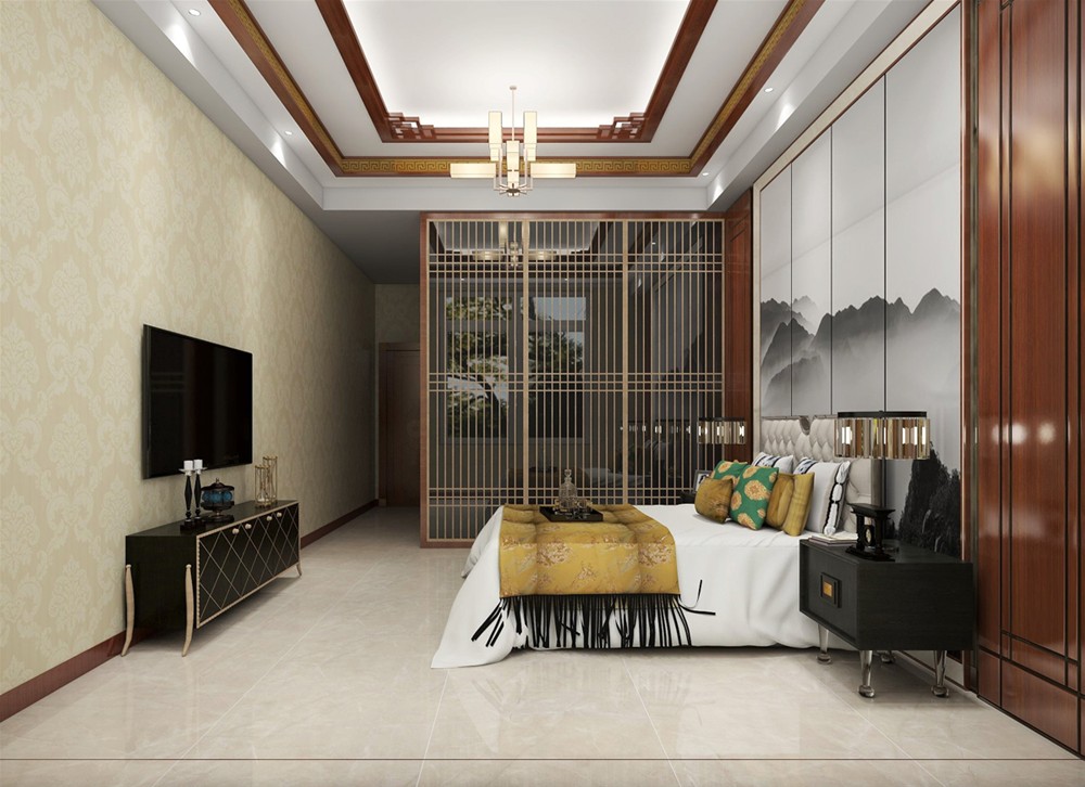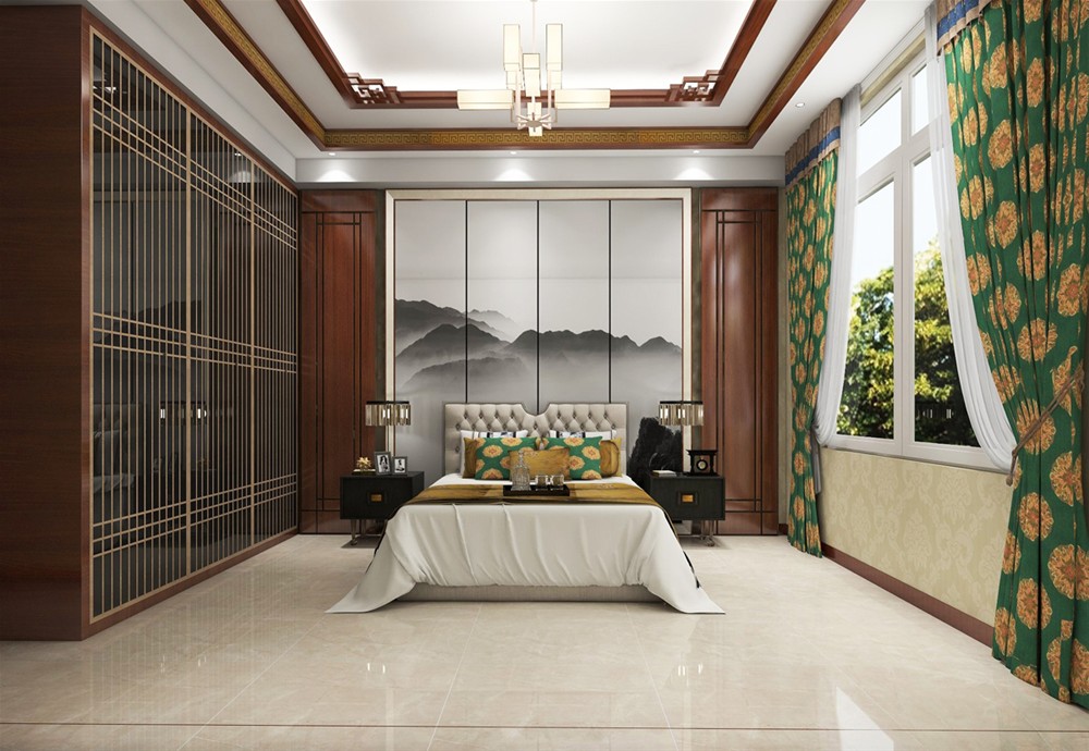 主臥床背景仍利用木色為主構架融會貫通,再加以富有意境的山水壁畫作為更深層的點綴,讓人們在整個空間裏感受傳統文化帶來的熏陶與動感,生命也變得溫潤充盈,富有韻味。