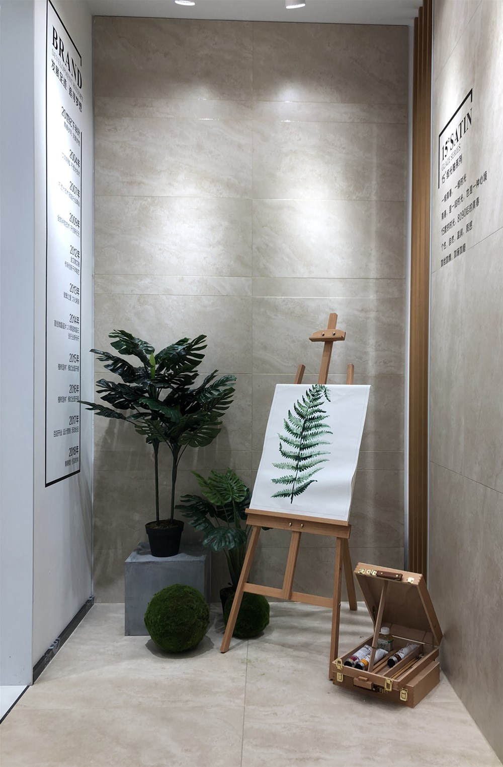 這是15°緞光釉泰坦米黃鋪設的現代風格模擬間,沒有更多造型,簡單的瓷磚切割鋪貼,優雅大氣的瓷磚紋理、到位的軟裝搭配出簡約大氣的空間。