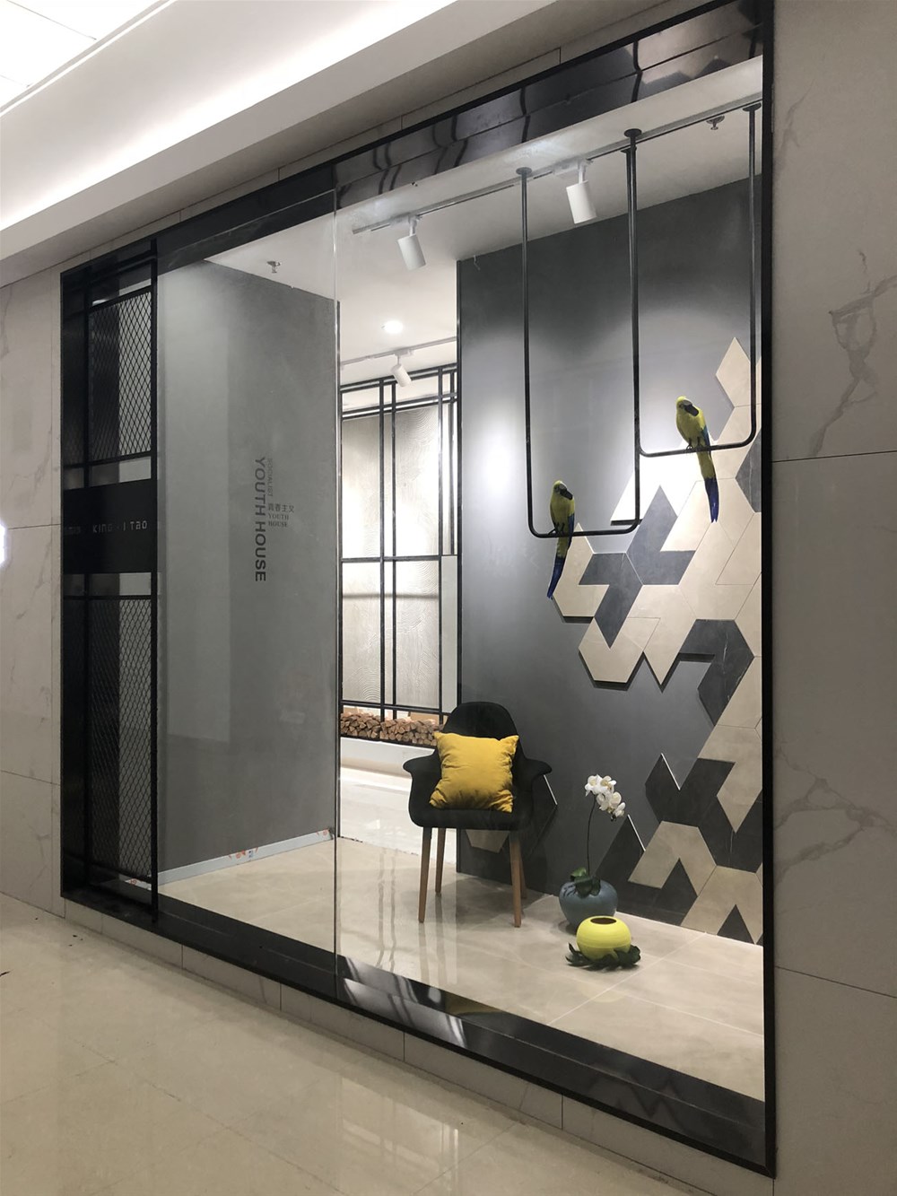 這是輕奢風格陽台、書房的模擬間,由噴墨瓷片鋪貼的牆麵個性時尚,搭配金屬軟裝營造出輕奢的質感。現在很多流行的咖啡廳參照這樣的設計來吸引消費者。