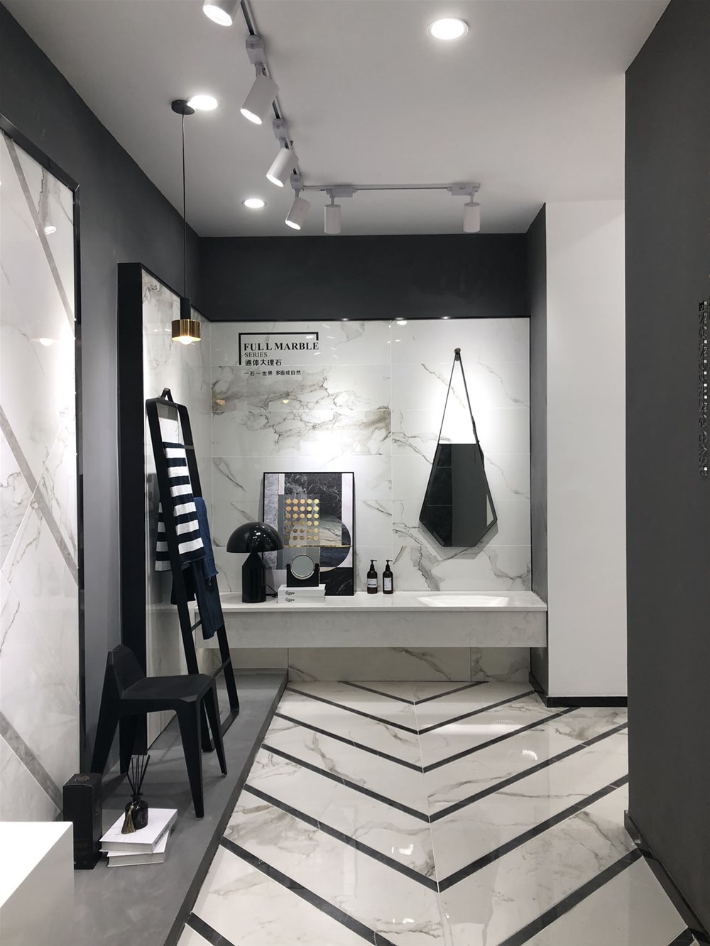 這是由九麵通體大理石鋪貼的現代簡約衛生間牆麵,亮麵磚易於打理,搭配線條簡潔的軟裝,深受年輕消費者喜愛。