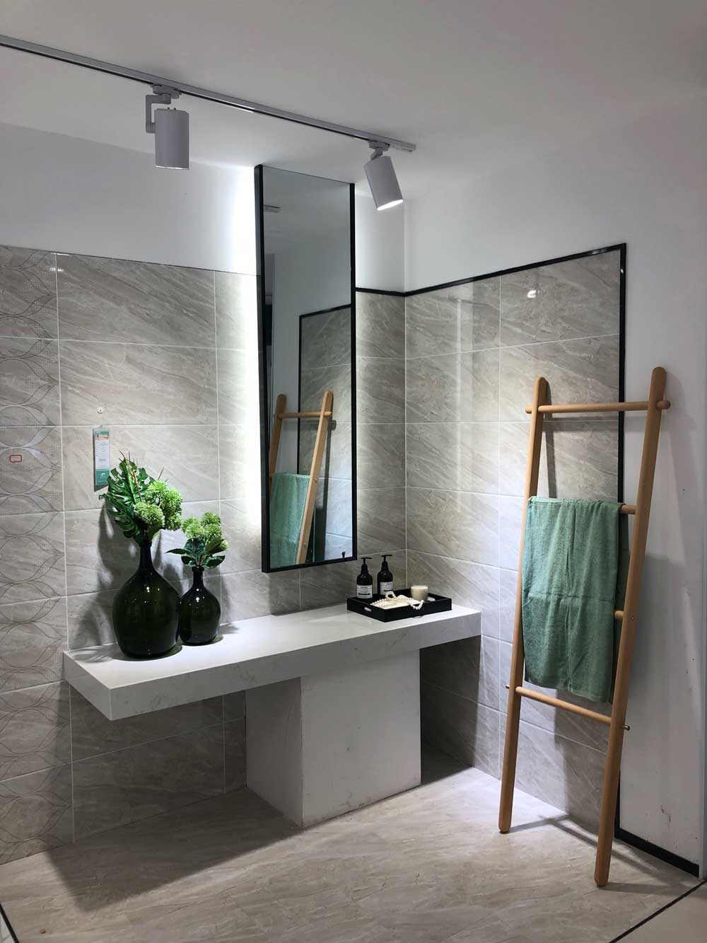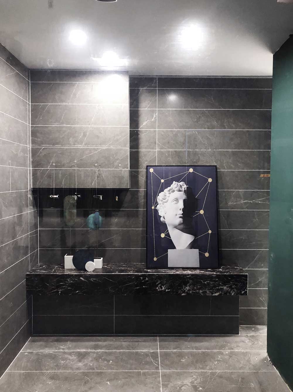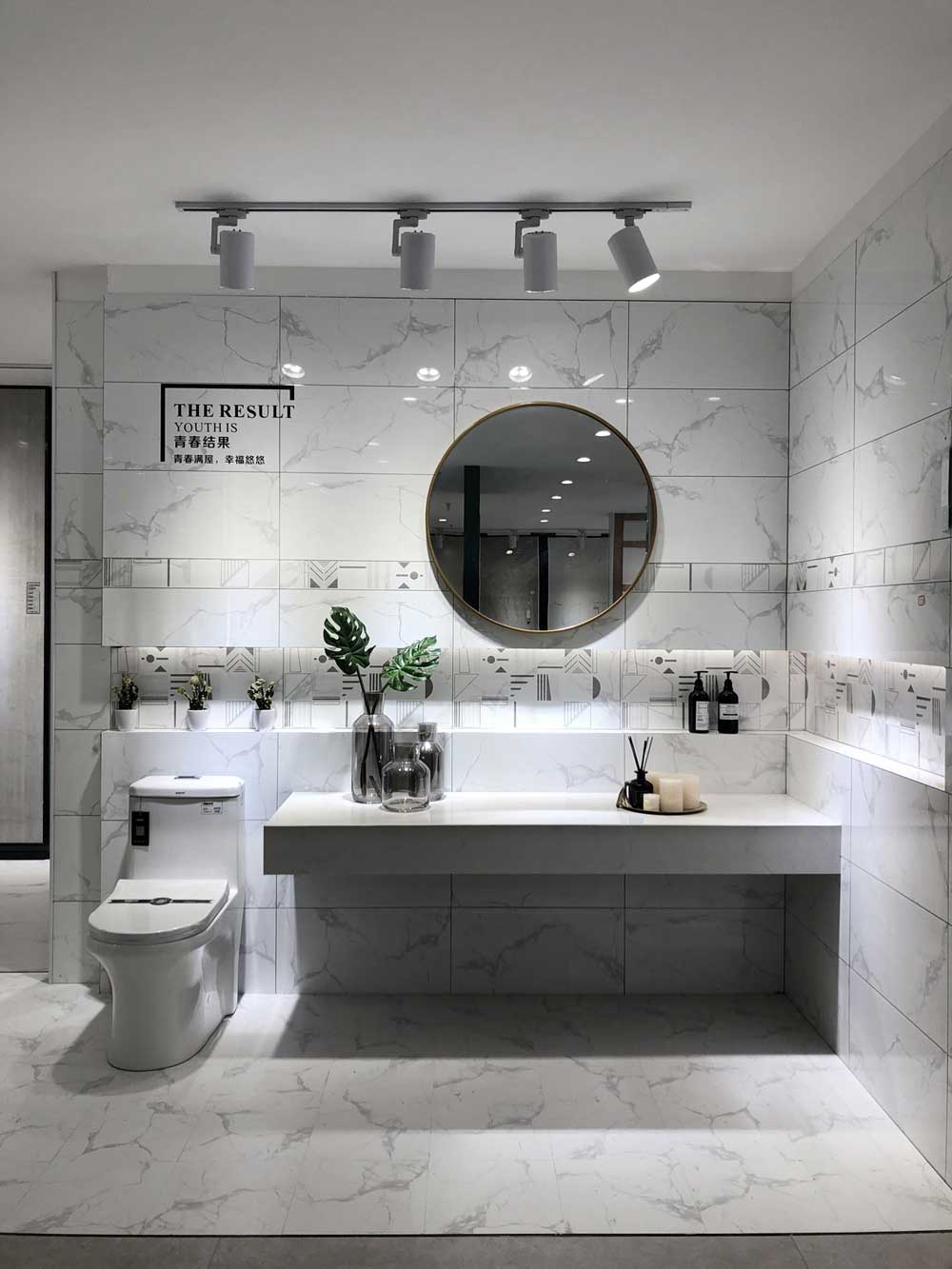 這是輕奢風格的衛生間,區別於傳統衛生間的鋪貼設計,選用的是九麵通體大理石KA9M61205雅士白、KA9M61207閃電灰、KB9M61208卡門深灰,切割規格不一,個性又和諧,背景選用15°緞光釉KFD8808保加利亞灰,一深一淺的顏色碰撞出視覺衝擊,這種大膽的設計手法很受年輕消費者喜愛,融合了青春館創新、活力的91看片在线观看免费元素。這空間產品同樣適用於客廳地麵、廚房牆麵等。