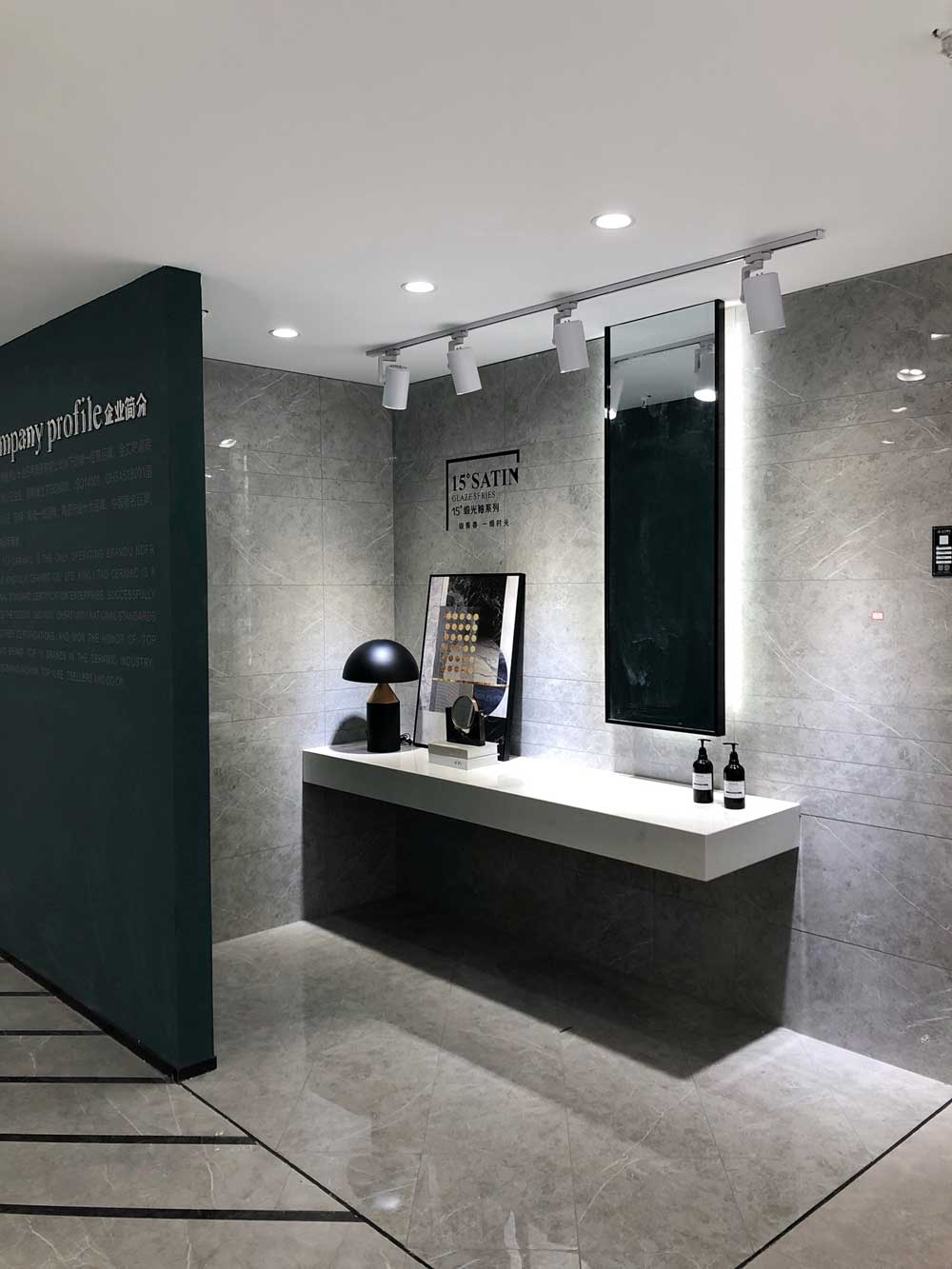 這是現代簡約書房的模擬間,鋪貼的是艾釉石KYP8118潘多拉灰,艾釉石是91看片的免费的网站店裏的明星產品,同行人都知道91看片的免费的网站的磚釉麵比別人亮,耐髒耐磨,因為91看片的免费的网站有自己的釉料公司,自主研發釉料。再說灰色磚給人安靜的感覺,書房選灰色就沒錯了。