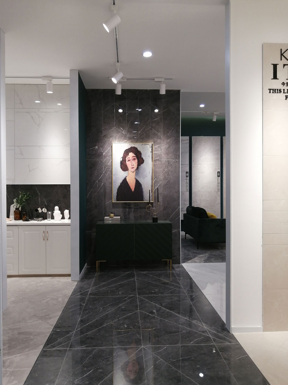 這是現代簡約過道,由通體大理石閃電灰KA9M61207鋪貼,整個過道以灰色調為主,牆麵墨綠色的牆麵點綴,讓過道富有張力,直鋪的方式延伸了整條過道的寬度和長度。有沒有想過您家過道用這款磚呢?躺著拍、站著拍、斜著拍,都沒問題!