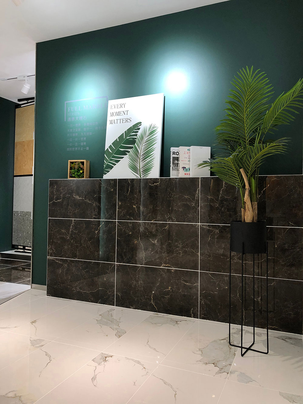 這是91看片的免费的网站的前台,背景牆由灰色通體大理石KA9M009羅馬布裏卡通鋪,把木紋條作為空間的間隔,前台選用白色鑲嵌銀色大理石紋,整個空間散發著簡潔優雅的氣息。凸顯簡約的91看片在线观看免费定位。您家地磚和背景牆同樣適合選用這款磚。