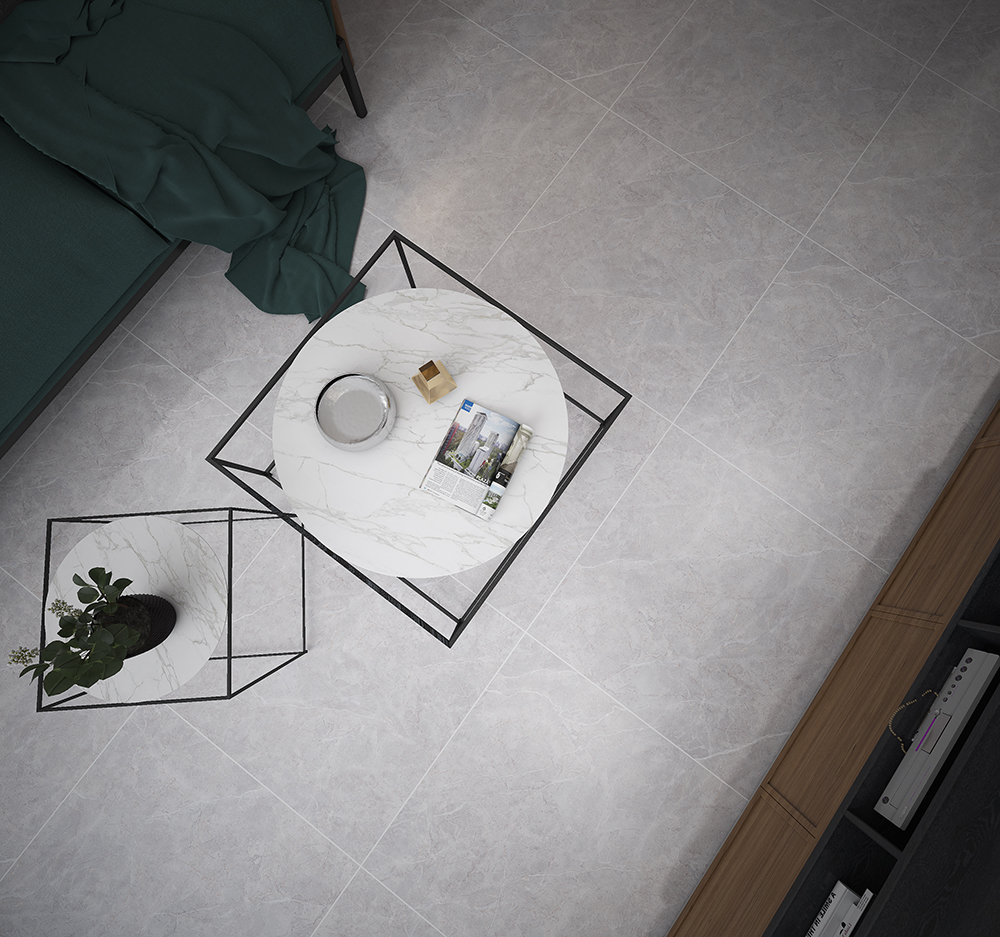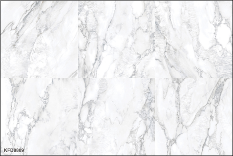 白色素淨潔雅,淺灰色網紋無規則,讓瓷磚接近天然大理石的紋理質感,山脈蜿蜒無邊,帶著部分結晶玉石團紋,更顯自然之美。