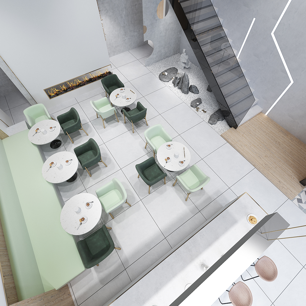 不同的幾何凝聚在不同的方塊裏,跳躍靈動,讓單調的空間增加許多亮色和點綴,讓空間有豐富的層次感。