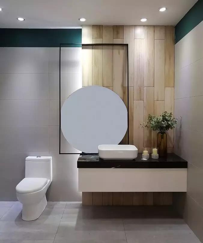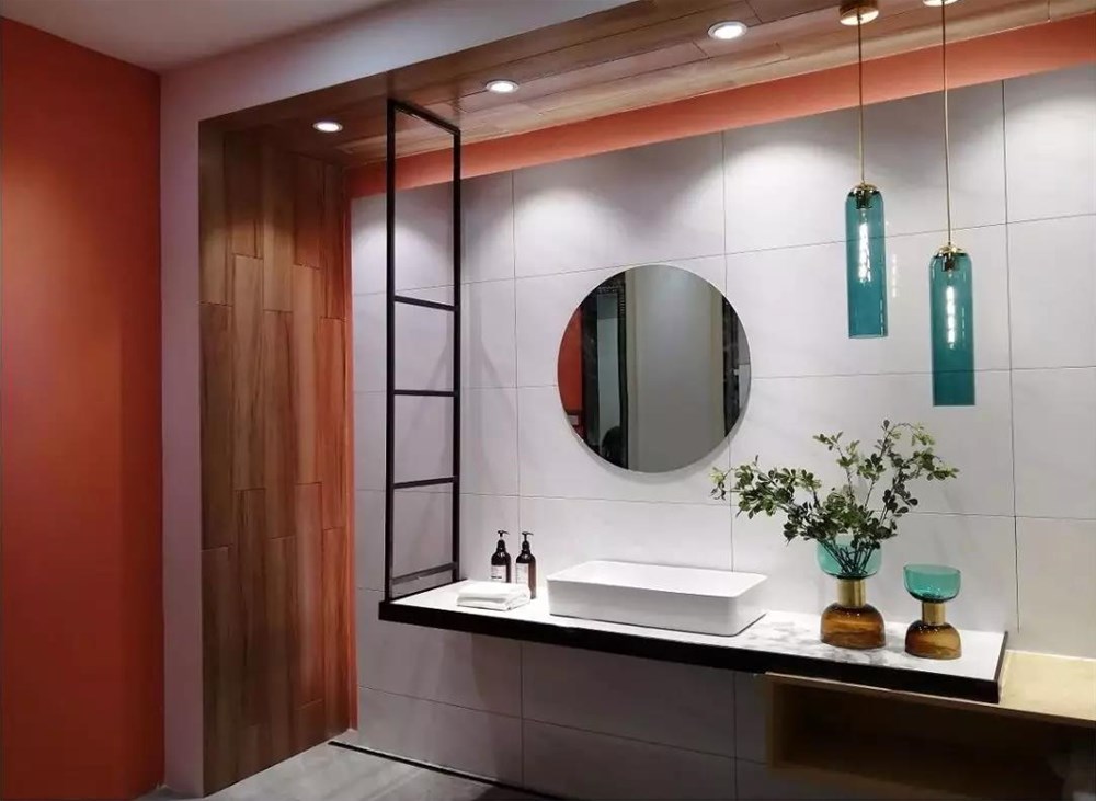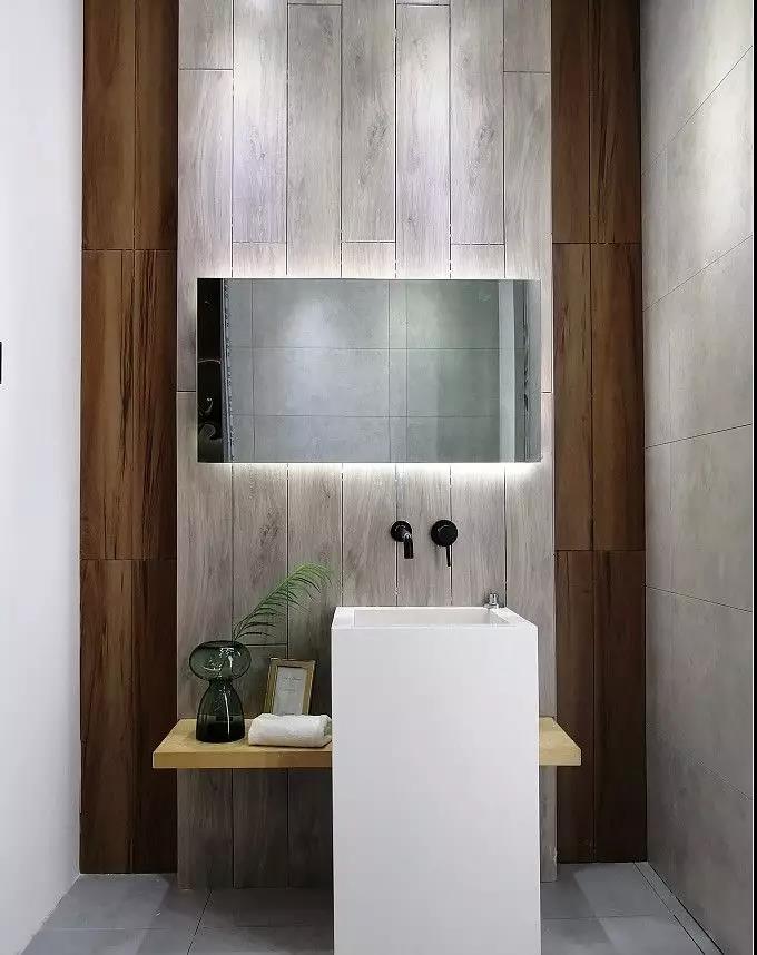 KPG48035是一款400*800規格的單麵精雕幹粒瓷片,洗手台背景采用了150*900規格木紋磚KFG159C12,營造出了木質的柔和,中和了灰色調的冷清,給衛生間帶來了輕鬆的氛圍。48035是一款采用精雕幹粒工藝的瓷片,通過精雕釉和幹粒讓瓷片有凹凸的條狀布紋立體感,讓牆麵更有空間感。
