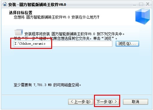 例如:假設要選擇I盤,點擊“瀏覽”,選擇I盤(安裝完畢後會在I盤生成3dshow_ceramic文件夾,軟件的所有文件都保存在這裏)