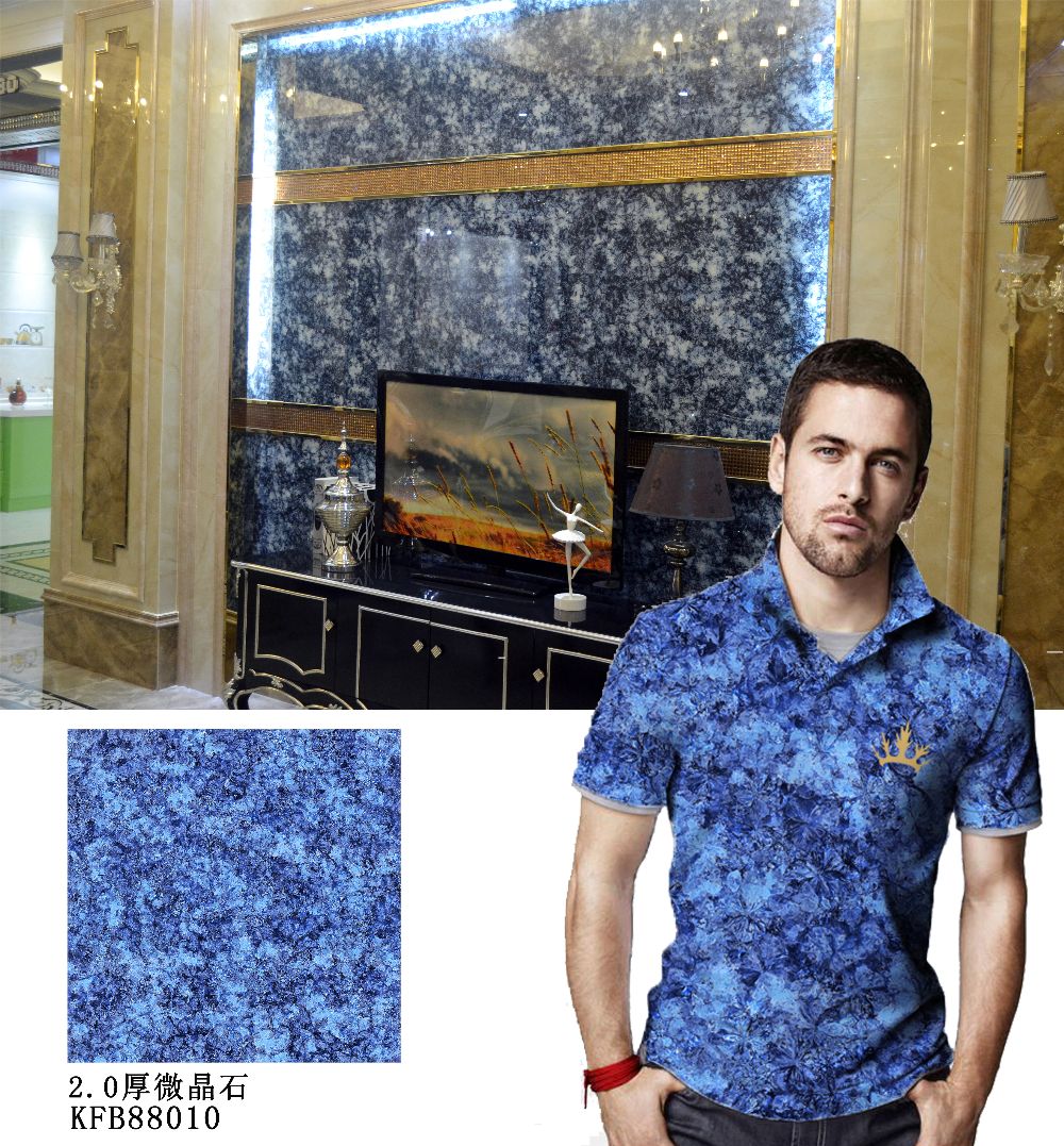 靈感來源於石材王國西班牙的綠鬆石,作為西班牙名石的代表,設計結合中國水墨的意境創作而成,靛青色的水墨色調均勻的分布沉澱下來,猶如一幅淡雅的藝術畫作。再經過全拋工藝的鏡麵處理,感覺像油墨停留在水麵的那般楚楚動人。裝飾空間呈現出十分典雅莊重的空間。