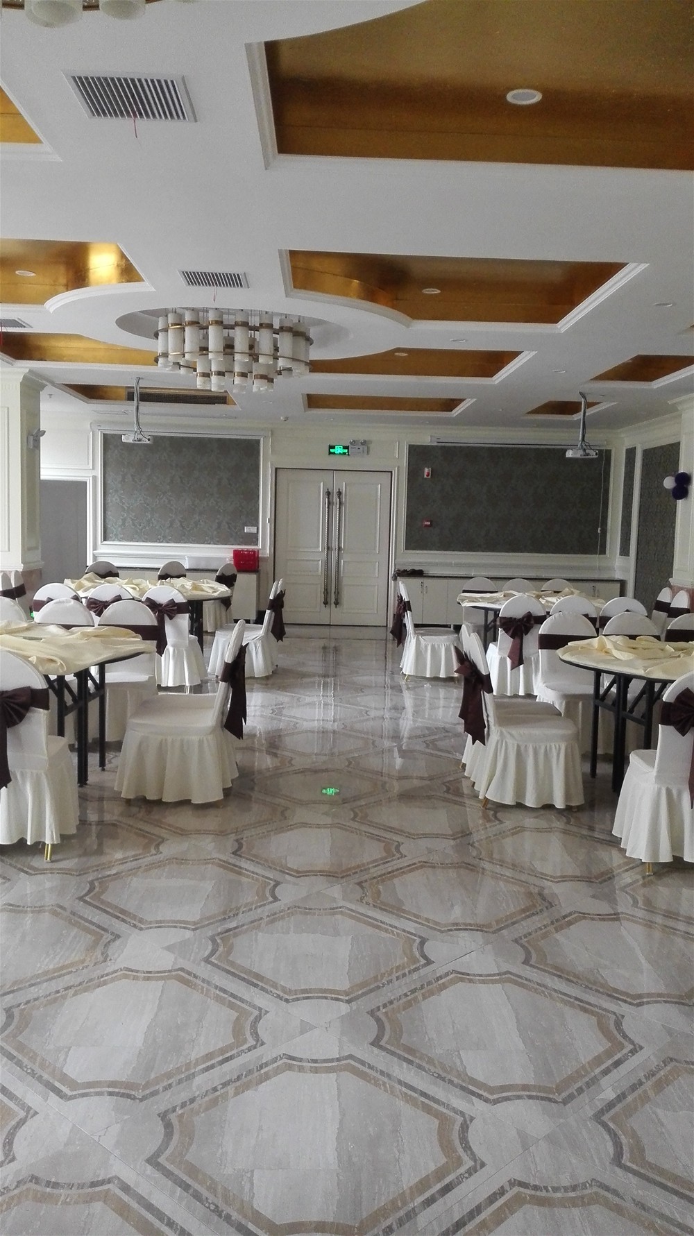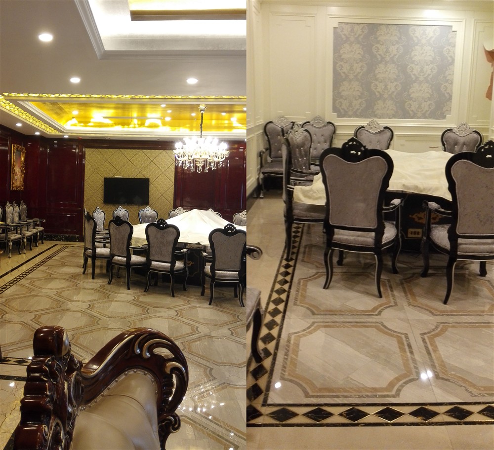 鹽城東林海岸大酒店內部裝飾,全部采用91看片的免费的网站陶瓷磚的產品進行裝飾鋪貼。餐廳及包間應用了91看片的免费的网站陶瓷磚愛丁堡係列拚花KYP8055H、KYP8062H、KYP8069H和愛特大理石金黃天龍KYP8085,包間茶水間牆麵采用曼彩時尚KPM36053鋪貼。酒店過道則采用愛特大理石金黃天龍KYP8085與黑金花KYB8017進行搭配。