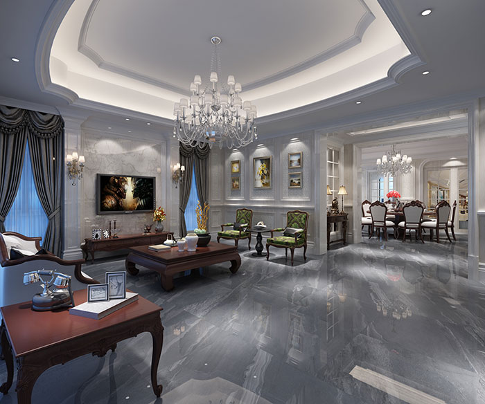 這是一個很大的客廳,因此設計師設計了一個造型別致的吊頂,鑲金邊的異型吊頂圖案,使平麵的天花板呈現出立體感,恢弘大氣。