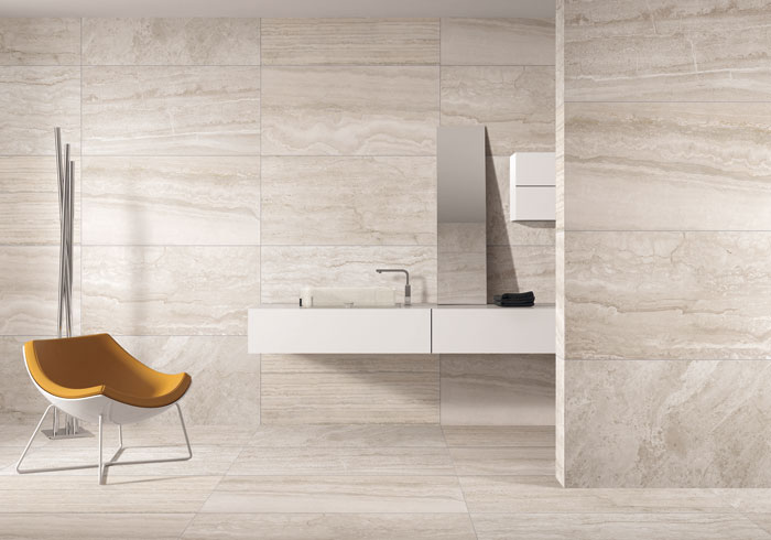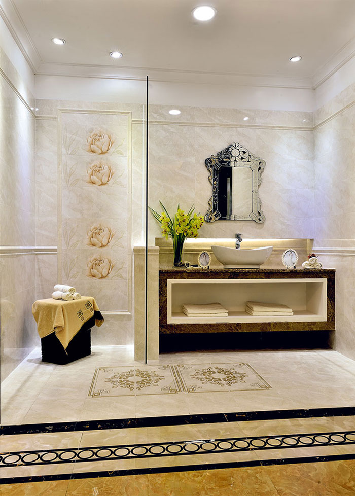 選擇啞光麵或具有砂岩質感、凹凸紋理的仿古磚,無疑是做好衛生間防滑的最好準備。