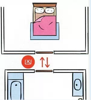 臥室門對到廁所門,會造成骨骼與肌肉的病痛及錢財流失。廁所是濕氣、臭氣、汙穢產生的地方,如果房門對到廁所門,剛好會全部接收(特別是強風倒灌的日子)。