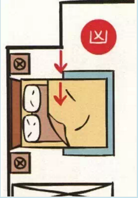 房門對到床,因對到身體不同的部位,會造成對應部位的功能性病變。房門與窗戶是室內空氣對流的進出口,處於睡眠狀態時,風會直接吹到身體,受到風寒的部位會造成病變。為考慮室內空氣對流,一般的房門下緣都會留有細縫,所以就算是緊關著門,隻要打開空調或窗戶開一小縫,都能使室外空氣進出。
