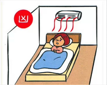 床位安置在空調下方,寒氣不斷吹向頭、肩、頸,人在睡眠狀態時,毛細孔會略微放開。如此放置,輕者經常感冒,重者會造成頭、肩、頸的神經緊張、肌肉僵化。