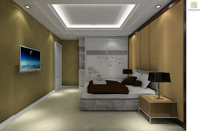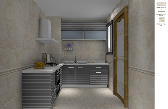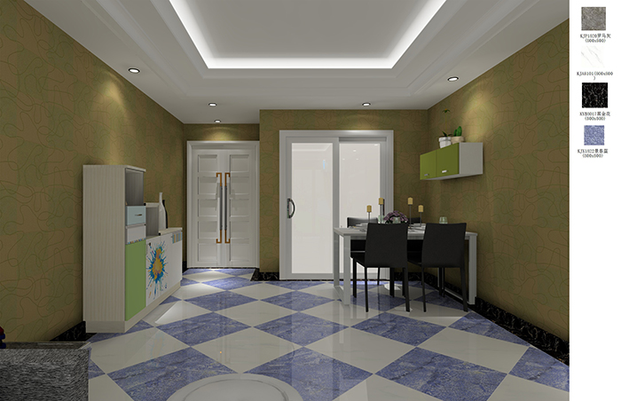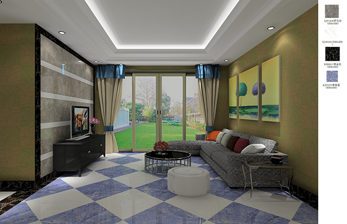 地麵以藍、白色為主,給人一種小清新的感覺。在瓷磚的鋪貼方式上也蠻是新意,地麵的菱形鋪貼,電視背景牆的寬、窄長條形鋪貼,讓家不在顯得單調無味。