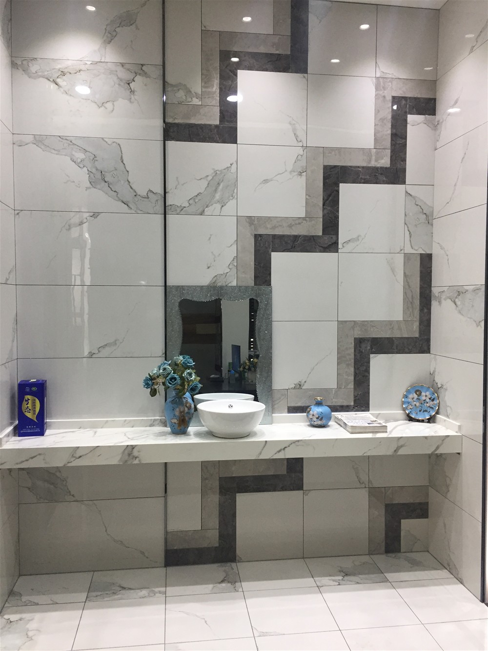 衛生間模擬間:卡拉卡石是近兩年最暢銷的產品,大氣、逼真的灰色調紋理變幻無窮,淺灰與深灰色瓷磚階梯式鋪貼,突破常規。高端大理石洗手台與空間呈現和諧統一,營造輕奢個性化空間。