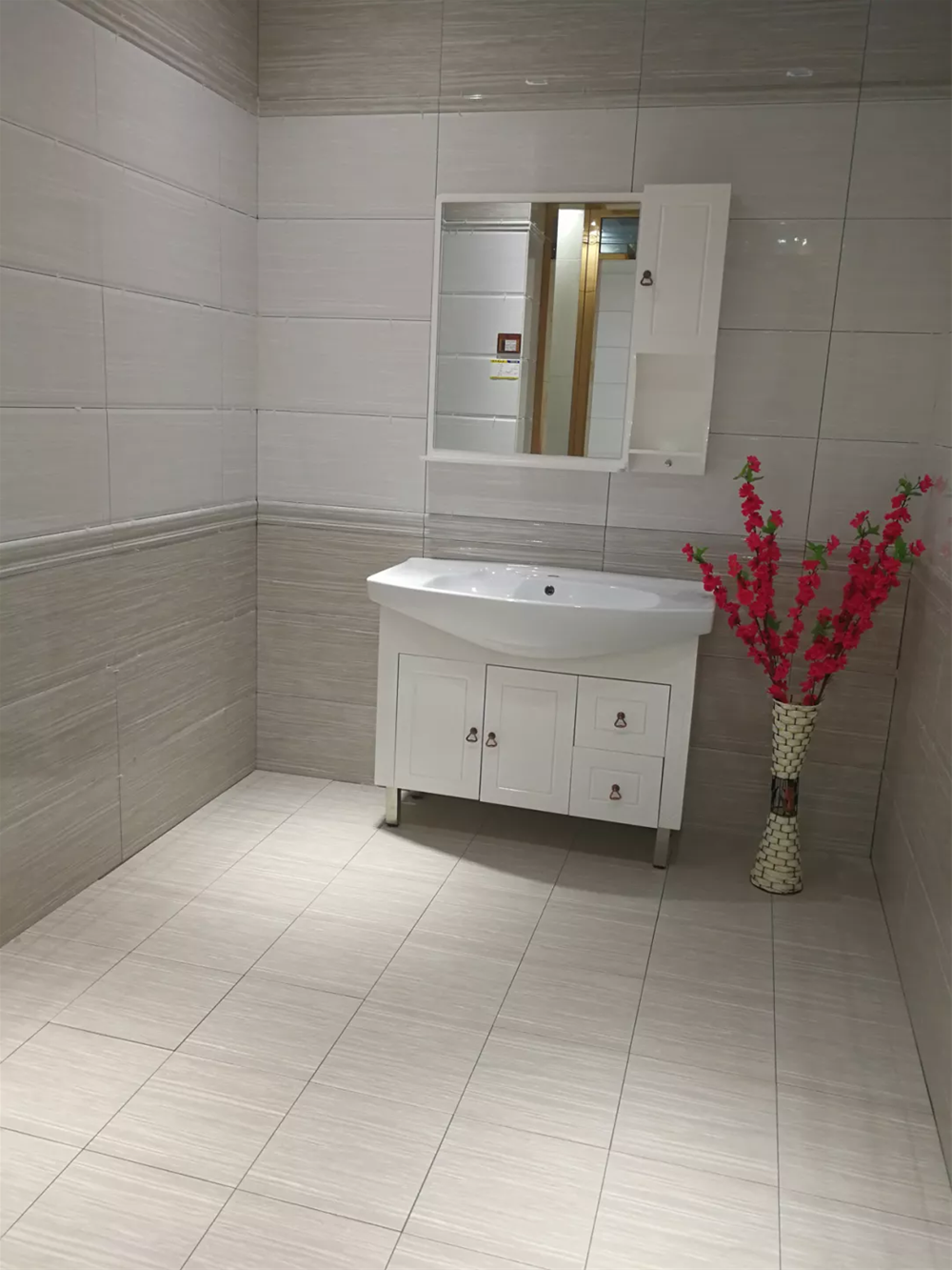 模擬間是專賣店必不可少的產品展示區域,它能很好地為消費者展示產品的鋪貼效果。由噴墨瓷片KPX36059鋪貼的現代衛生間,一深一淺搭配出空間層次感,地麵300*300的是防滑係數高的小地磚,非常符合衛生間防滑的需求。91看片的免费的网站陶所有的廚衛噴墨瓷片都配有花片、腰線、防滑小地磚,節省了消費者再找配套產品的不必要麻煩。